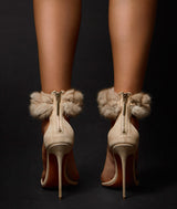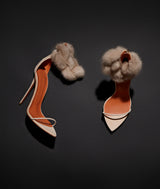 A balance between the extravagant and the barely there. A sumptuous mink chain ankle bracelet, juxtaposed with a delicate suede toe strap, set on a vertiginous solid steel spike heel, contribute to an opulent sandal with a delicately feminine yet excessive aesthetic.