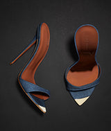 Lucre is crafted in darkly blue Italian denim, has the most diminutive toe strap, the slimmest vertiginous solid steel spike heels and is finished in 9ct gold plated hardware.
