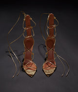 Featuring ultra slim lace strapping, vertiginous solid steel spike heels, glittering metallic Elaphe snakeskin and 9ct gold plated hardware.