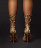 Tie yourself up in the lustrous skin of a gilded serpent with delicate pale gold leather laces...