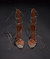 Featuring ultra slim lace strapping, vertiginous solid steel spike heels, glittering metallic Elaphe snakeskin and 9ct gold plated hardware.