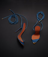 Beyond barely there, the Sesso with its refined, feminine aesthetic, takes sex appeal in a sandal, to its pinnacle. Featuring ultra slim lace strapping, vertiginous solid steel spike heels, darkly blue Italian denim and 9ct gold plated hardware.