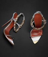 This style symbolises sex, power, delicacy and femininity with its bold pale-gold diamond-cut chain ankle strap, pale-gold plated hardware and Grecian inspired delicately woven rope straps and knots. The balance of the polarities between the energies it embodies is intoxicating.